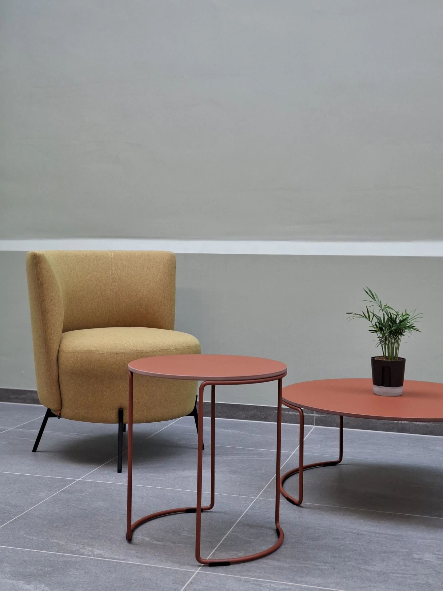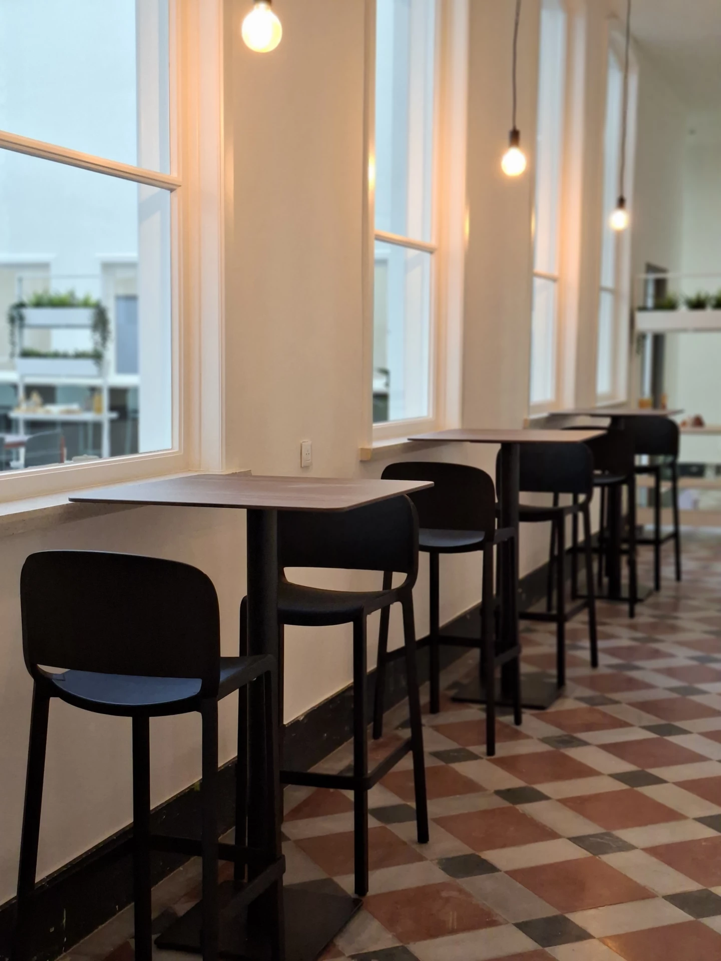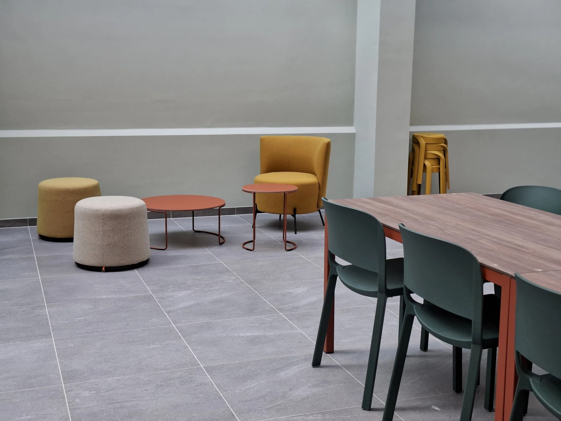 - Flexibele tafels, eenvoudig verplaatsbaar zodat de ruimte zich snel kan herconfigureren naargelang gebruik. Van individuele werkplek naar groepsactiviteit.
