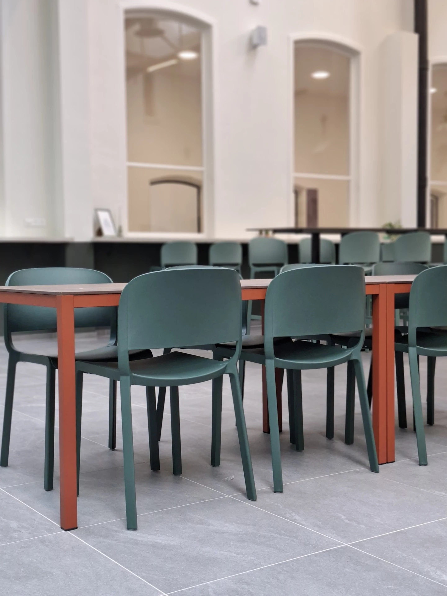 - Stapelbare stoelen, duurzaam vervaardigd, comfortabel én makkelijk op te bergen om zo optimale beschikbaarheid van ruimte te garanderen.